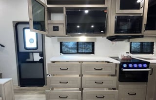 Most 5th wheel rental RVs come with a equipped kitchen, check the listing details or ask the owner for specific items. Renters may choose to bring additional cooking appliances or equipment if they desire.