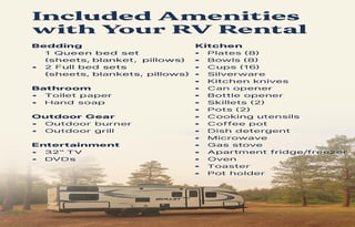 The RV owners determine what is available with the rental, such as bedding and utensils. Renters should review the RV listing description or ask the owner for more information. Storage options for personal items can vary by RV, so renters should check with the owner for available storage space.