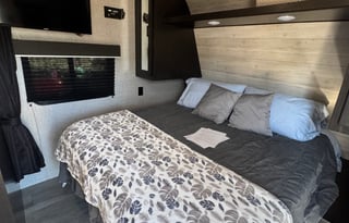 The RV owners determine what is available with the rental, such as bedding and utensils. Renters should review the RV listing description or ask the owner for more information. Storage options for personal items can vary by RV, so renters should check with the owner for available storage space.