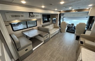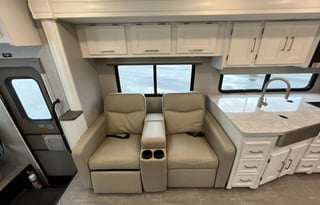 At RVshare, a luxury RV rental is classified as a luxury motorhome with plentiful space and amenities such as full kitchens and bathrooms, multiple sleeping areas, and advanced sound systems or outdoor spaces such as outdoor kitchens or entertainment areas.