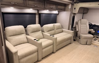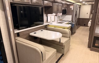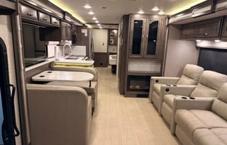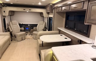 At RVshare, a luxury RV rental is classified as a luxury motorhome with plentiful space and amenities such as full kitchens and bathrooms, multiple sleeping areas, and advanced sound systems or outdoor spaces such as outdoor kitchens or entertainment areas.