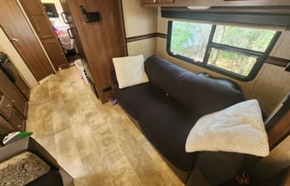 The RV owners determine what is available with the rental, such as bedding and utensils. Renters should review the RV listing description or ask the owner for more information. Storage options for personal items can vary by RV, so renters should check with the owner for available storage space.