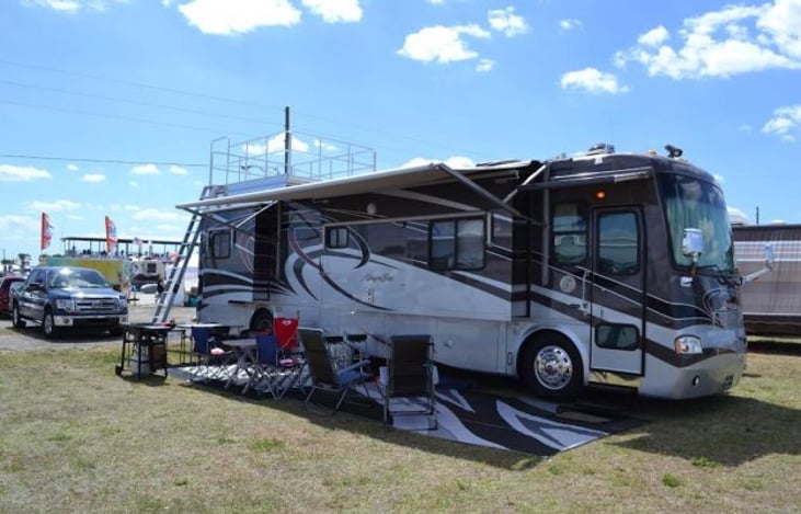 Tiffin Allegro 40 QSP QBA sleeps 6 adults . King BR, 2 fold out couches. Comes fully stocked with linens, towels, cookware, coffee maker, toaster oven, outside table and chairs, gas grill, Dish 250 network, and over air, 2 burner inside gas stove top, convection/microwave, Cutco cutlery, SS flatware, unbreakable glassware and plates, high end cookware, plus much more.