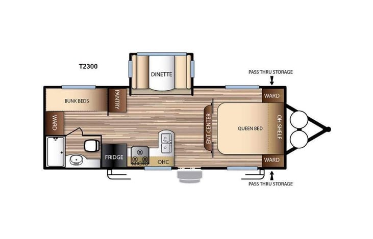 As you enter this travel trailer, the private front bedroom is to your right. It includes a sliding door entry on each side. The queen bed has a wardrobe on each side including an overhead shelf for additional storage.