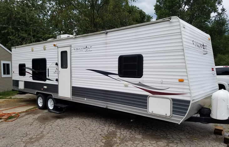 The trailer had a smell when we arrived. Had to get air fresher to get it to a point where we could stay in it. The bed matrasses are all worn and not comfortable. Had to get bed toppers. No awning on the trailer as it had being ripped off somewhere along the way. The radio never worked. Ad says it sleeps 10 but there is only 4 plates and two coffee cups.
