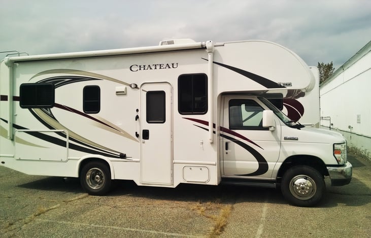 24' Thor Chateau Class C motor home sleeps up to 5 people. Rear queen size bed, queen size bunk over the cab, and dining table folds down into a single bed. Large rear bathroom with full size shower, sink, and toilet. Plenty of interior storage, and large exterior storage compartment. Full kitchen including microwave, stove, and refrigerator/freezer. Fully electronic awning with LED lights.