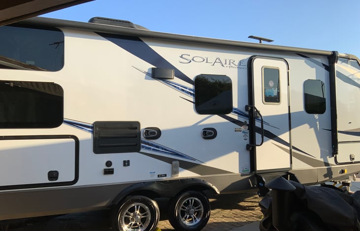 2021 Forest River Palomino Solaire Ultra Lite travel trailer with all new amenities. Trailer is 24 feet long and comes with a huge lighted awning, outdoor fridge and sink, outdoor shower, solar panels, and outdoor Polk audio speakers. Trailer can sleep up to 8 people comfortably with a king size private bedroom (with TV), full size double bunk beds, and a u-shaped dinette that converts to bed.