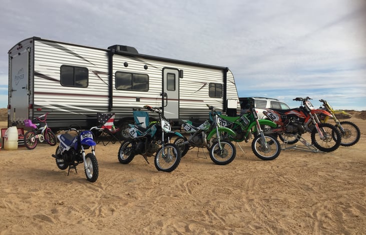 Great tow behind trailer that you can also use to haul your precious toys (I.e. dirt bikes, motorcycles, ATVs, etc.). Enjoy your outdoor adventures with this toy hauler today!