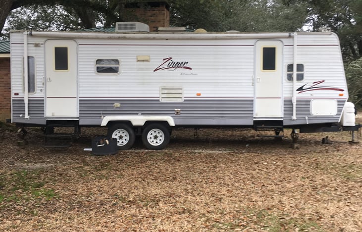 My 27ft Zinger Travel Trailer w/ Slide out and 21ft Canopy extends out over the front w/ 2 door accessibility to the camper has lots of accommodations for a family of 5 to move and sleep comfortably. No need for Public Restrooms and showers because this camper has all the luxuries of a private bathroom w/ bathtub, shower, toilet,. mirror, and sink.