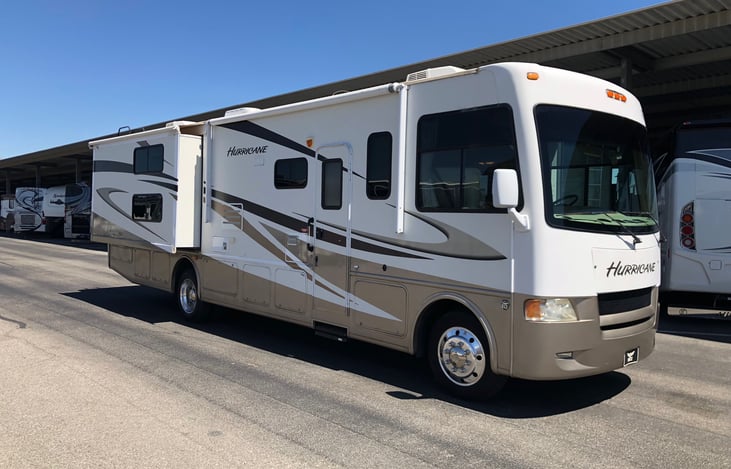 Hurricane 34' Class A motorhome for rent - great family friendly floor plan with 3 slide outs. Sleeps 8 - Rear Queen in the master, 2 twin bunk beds long enough to sleep taller teens/adults, dinette that converts to a bed and a pull out full size sofabed. Onan Generator, two AC's.