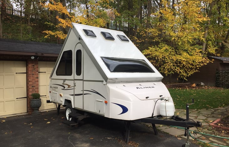 Unique hard sided A-Liner pop-up camper. Setup in less then two minutes. Features include A/C, heater, mini fridge, three burner stove-top, double size bed with memory foam mattress, table with bench seating, and loads of storage! Equipped with electric brakes, requiring a 7-way connector.