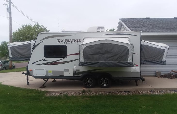 2013 Jayco Jay Feather Ultra Lite 18D in great condition to take to your dream camping vacation! Whether you are heading to the State Parks or the lake, This one is for you! 3 fold down beds, All Queen Size! SUV/truck towable with trailer brakes, 7 pin with brake control required. Monthly Rentals Available! Repeat renters will receive a 10% discount on the nightly rental rate!