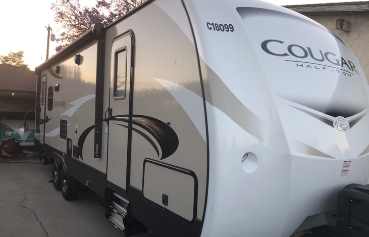 27SABWE 2018 Cougar with 1 touch auto level system. It has a front king size bed with a very confortable pull out bed that sleeps 2. The dinette sleeps another 1 or 2 smaller people. It also has 2 recliners that I can easily fall asleep in. This is a very nice trailer. Electric awning, Large LED tv with DVD and Bluetooth, outdoor speakers, led light strip under awning that looks awesome at night.