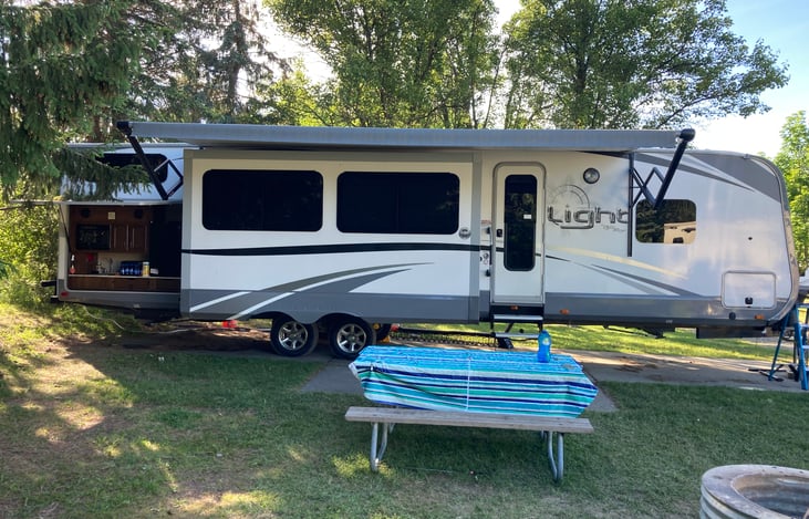 Welcome to our home away from home! 38' Bunkhouse for all your glamping needs. The trailer comes with everything you need for a successful family outing coffee maker w/filters, pots, pans, silverware, electric griddle and a RV Q. You just need pillows, blankets and camp chairs!