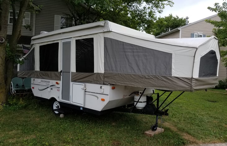 A very nice compact camper when closed. Then you open up to a 4 seat kitchen nook with table that sleeps 2. A 6 seat booth with table that sleeps at least 2, and a king bed and a queen bed. This camper also has a fresh or city water sink, a 3 burner stove top inside and a stainless grill for the outside.