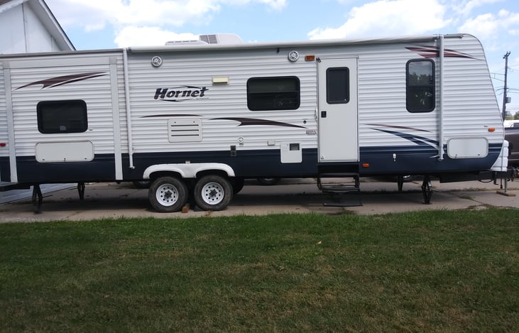 2009 hornet sleeps 8. Master bedroom with full size bed. Bunk beds in second bedroom.Bathroom with tub and shower. Spacious kitchen area with stove, fridge and counter space. Living room with fold out full size mattress. TV with dvd player, Outdoor speakers.