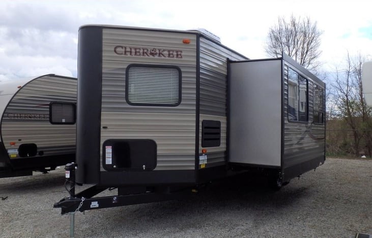 Very nice 2017 Forest River Cherokee 274VFK. This trailer has the kitchen up front, with a large slide out. Front and rear entrance, so the master is accessible when everyone is asleep. From inside, you can reach the master through the jack & jill bathroom or by the hallway. The couch folds down to a bed, as does the dining room table.