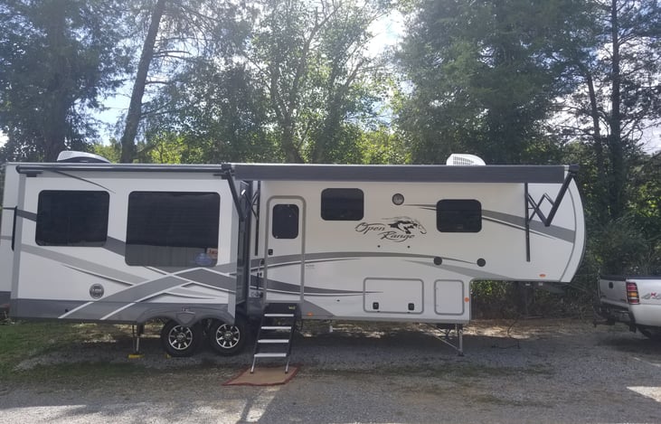 Beautiful new camper with all the luxury's, 39in TV/DVD , Bluetooth stereo, fireplace. 20ft awning that retracts at the push of a button. We have two separate A/C Units with two separate controls to keep everyone happy. We supply a Keurig but bring k-cups. It has a king size bed in the master bedroom and a queen size pullout bed in living room. there are also two recliners in the living room with ...