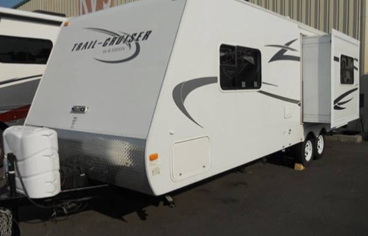 Trail lite cruiser 27’7”, hitch weight 566lbs base weight 4246lbs GVWR 6160 air conditioning 13500 BTUs fresh/ grey/ Black water capacity 30 gal has two access doors suitable to sleep 6 includes side pop out for couch, out door shower and weight distribution hitch.