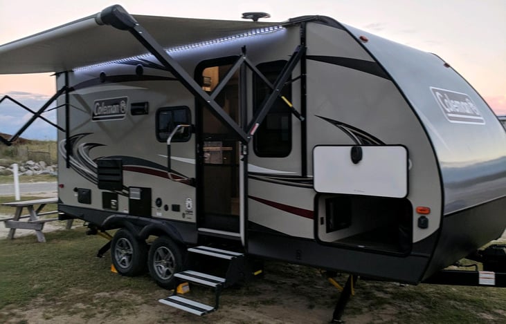 Perfect for a couple and 1 or 2 small children. Very easy to set up. Electric awning, power stabilizers and an electric tongue jack. 42 -inch TV. Large slide out creates plenty of room inside. Includes everything you need to make your camping trip perfect: outdoor grill, rug, table and chairs. Inside you have linens, family-friendly dvds and game, dishes and cookware.