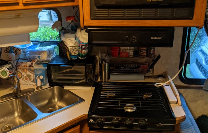 Very comfortable basic class c motorhome. Has stove top, refrigerator, double kitchen sink, full bath, separate shower, AC and Heat, Hot water heater. Tv with DVD and digital antenna. Also comes stocked with movies and board games. Has full size queen in rear bedroom. King size bed above cab. Coach folds down to double bed. Dinette folds down to double bed. All linens included.