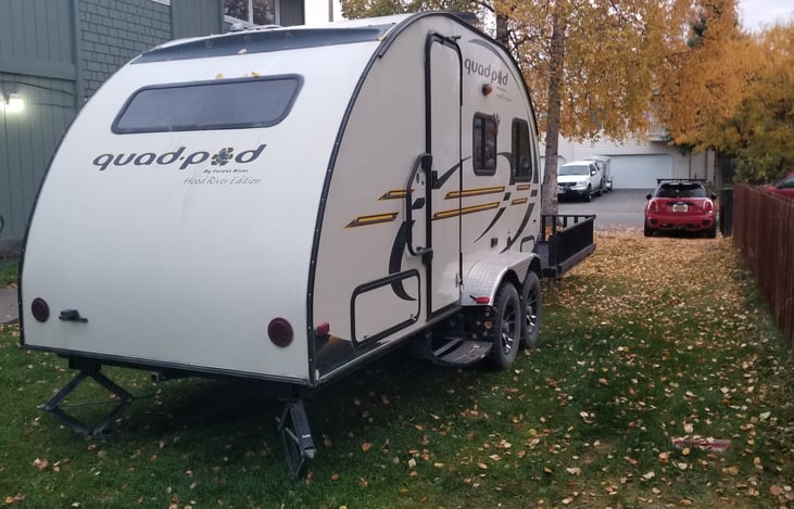 Extra light weight toy-hauler 3750 lbs. dry weight capable of loading 3000 lbs. on front deck. Dinette turns into bed, 2 bunks , sleeps 4, 30amp Hood Edition r-pod quad-pod, Mirco fridge with freezer.