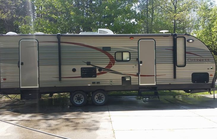 Camp in luxury in our 2015 Cherokee travel trailer. This is a 30 ft travel trailer in great condition. Sleeps up to 10 with a queen size bed and double bunks.