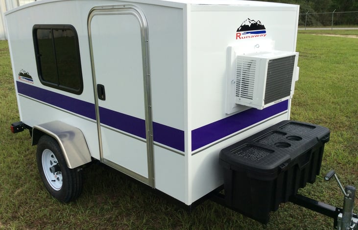 Cute Runaway teardrop-size camper with 46.5" wide bed, 8' interior length, 5,000 btu air conditioner and ceramic heater. Plug into campground power to use AC, heater, LED rope lighting and other devices plugged into the internal power strip. It is basically a comfortable bed on wheels that you can tow with practically any car (it only weights 700 lbs - we tow it with a Toyota Corolla).