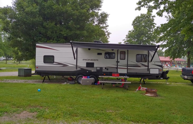 Get away and relax with family and or friends in this spacious 2019 Heartland Pioneer. This bunkhouse style camper has up to 7 beds with both the couch and table folding down into beds. The super slide out creates plenty of space. The camper is fully stocked with bed linens, kitchen cookware and dishes. I will deliver and setup camper at your site for a $150 all in one fee.
