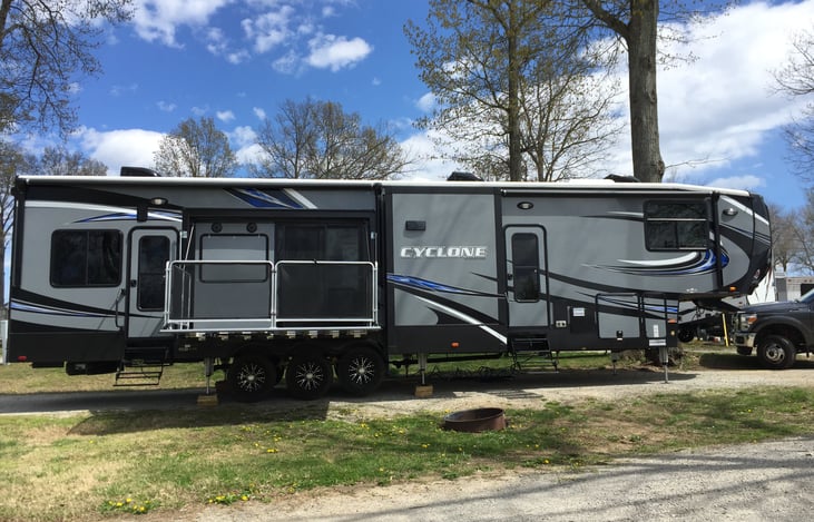43ft 5th wheel Toy Hauler. Has a side deck and a back deck for Relaxing and enjoying the views. One full bath with a tub and a half bath. Comfortably sleeps 8. Residential full size fridge, microwave/convection oven, regular oven, kitchen island counter.