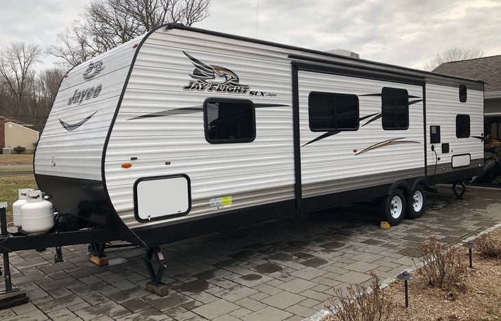 Fully equipped towable travel trailer with all the amenities of home. Master bedroom has a queen bed with privacy curtain. Back bunk area has 4 bunks with privacy curtain and plenty of storage. Dinette and couch convert to beds as well to sleep a total of 10.