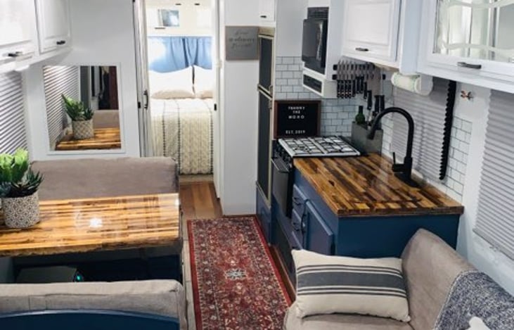 Franny is our beloved moho! She is beautifully remodeled with custom butcher-block countertops and high end window treatments and flooring. Lovely coloring and accents on all surfaces to give you a 100% at home feeling while moving or stationary! Brand new tires and backup camera for safety. Wifi accessible DVD player with video streaming apps installed. Whole "house" speakers.