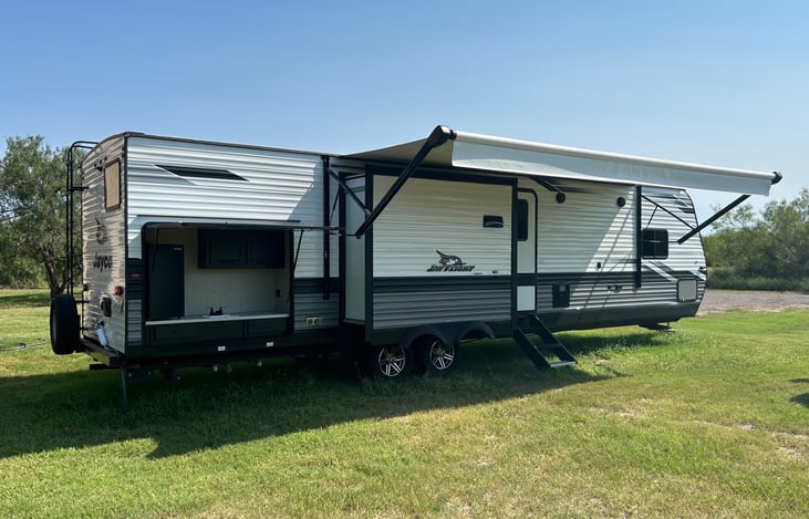 The RV is parked in Kingsville on 30acres next to homestead, it has full functional...water, sewer and electricity, BBQ pit and picnic table, perfect for your weekend getaway along the South Texas Coast.