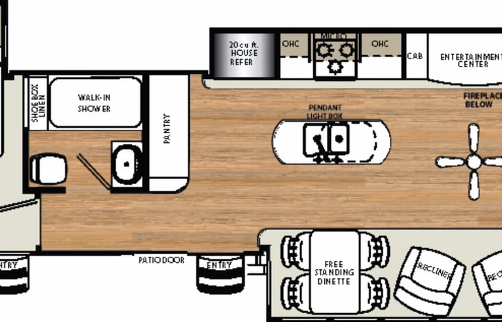 The comforts of home surrounded by nature. Have your outdoor adventure and immerse yourself in a luxury interior. With walls of windows and opposing dual slides the spacious floor plan draws the beauty and sun right in. Double door, bottom freezer residential fridge provides the room for all of the essential of an extended stay.
