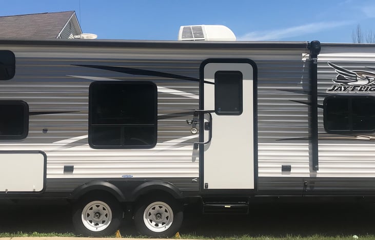 2018 bunkhouse travel trailer with full size bunk beds, convertible couch, queen bed, and dining area that also turns into a bed. Which means that you can sleep 8. It is very spacious inside and has lots of areas for storage. It also has a mini fridge on the outside for drinks or snacks. We are pet friendly and THE TRAILER IS ONLY AVAILABLE FOR DELIVERY.