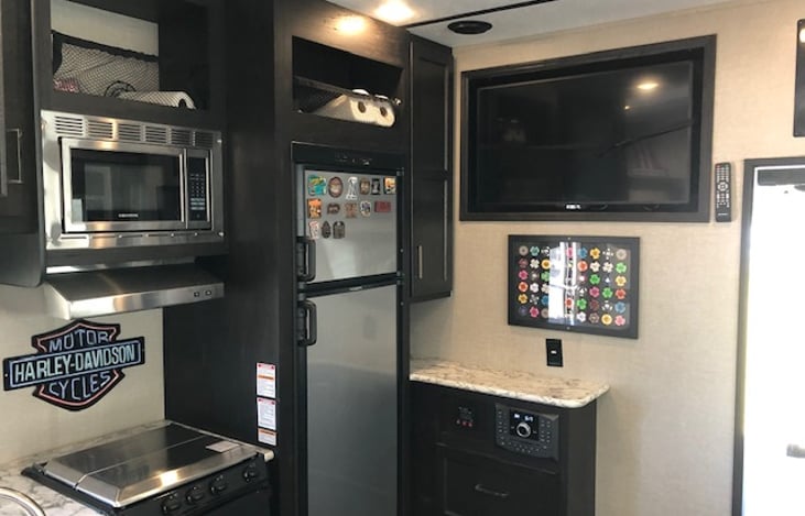 Top of the line toy hauler. Everything you need to enjoy your trip. 3 tv’s, large refrigerator, separate master bedroom, and second room with two queen bunks. This camper is set up to create a one of a kind camping experience. It's like taking your house on the road!