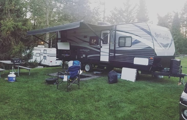 New 2018 Springdale 28 footer....has outside refrigerator, prep area, awning with LED lights, outside speakers, Heater and A/C, Solar Panel with Solar hook up. Has an outdoor shower station as well. Trailer is equipped with weight distribution hitch that can be used. Comes stocked with bedding in the master sleeping area, towels, utensils and plates.