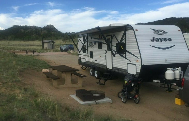This Jayco trailer is ready for your next camping trip. The living room is spacious with a huge 32" TV (with a Roku) and Bluetooth radio. About everything you would need in a kitchen is included. Rear bunks are comfy for kids or even adults. The main bedroom has a 24" smart TV to let you relax in bed. Trailer rental will include a anti-sway hitch.