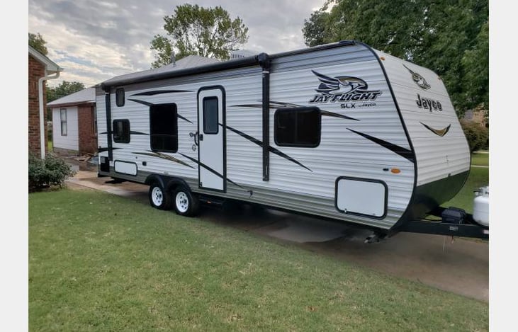 2018 JAYCO 264bh- 26 foot travel trailer. Queen bed sleeps 2, rear bunk beds sleep 4 adults, couch folds out to sleep 1-2, and dinette table breaks down to sleep 1-2. Large bathroom, shower, Easily towable at 4400 pounds. Full size fridge, freezer, Large a/c unit, water heater, microwave, power awning. We have all different size travel trailers ranging from 14-28 feet.