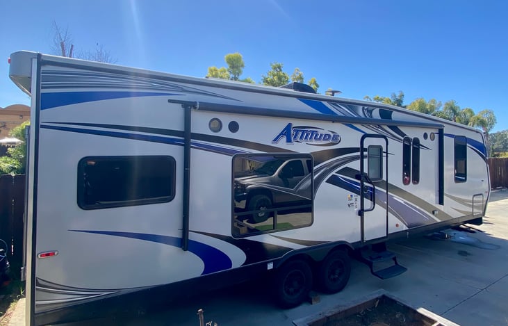 Welcome! We have an attitude toy hauler! Perfect for family getaways. 6-8 people can sleep comfortably aboard.