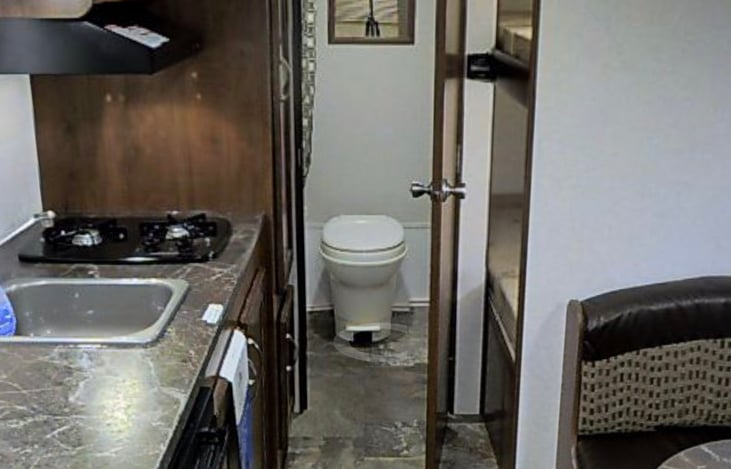 Restroom has never been used, we prefer the park restrooms just because we don’t like the hassle of pumping so it is brand new!! Plenty of cupboard space for food and items.