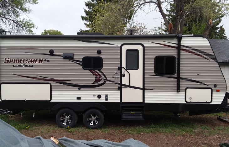 2019 kz sportsman 23ft with slide out sleep at least 6-8 depending on the size of kids etc. It has bunkbeds that are close to full size and a separate queen bed and the standard table that makes into a bed. There is blue lighting inside the trailer and LED lights on the awning. It also has one slide out and has a nice pull out grill, fridge and sink that is under the awning.