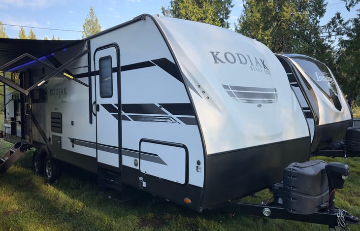 Our 2022 Dutchmen Kodiak Ultra-Lite 289BHSL Travel Trailer is 30 feet (33 feet with a hitch and rear bumper). It sleeps 6 to 8, or ten adults, depending on how cozy you want to be. The heater and AC keep you comfortable. Smart TV, you can connect with WIFI to your phone and watch YouTube and other apps from the internet.