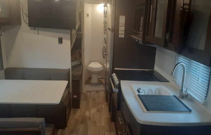 One queen size bed with closets on each side. Portable generator if needed. A Portable grill, portable table, coffee pot, toaster, plastic plates, silverware, Pots and pans are included. 128 qt Cooler. Bunk beds. Bath room; toilet, Shower and bathtub. Kitchen table converted into a bed. Couch converts into a twin bed too. Family games and Smart TV that just needs hooked up to WiFi. USB OUTLETS.