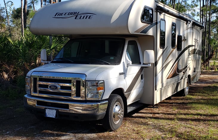 This 2017 Thor Freedom Elite 29-footer is perfectly sized for the quiet getaway weekend or better yet that long summer vacation with the whole family including your dogs! The RV has 2 slide outs, private master bedroom with a queen bed and spacious over the driver space that can be utilized as sleeping quarters or additional storage.
