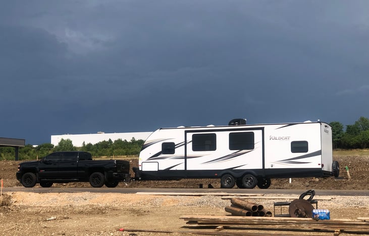 A 2019 Forest River Wildcat 292QBD. Although it's a longer travel trailer with tons of amenities and a large slide out, it can still be towed with most 1/2-ton trucks (~6,500 lbs. dry w/<700 lb.