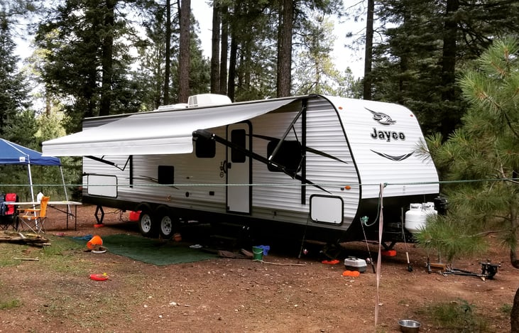 Hello! Our 2017 Jayco Jayflight SLX 284BHSW SLEEPS SO MANY PEOPLE! Full size bunk, jack-knife couch, dinette, and queen bed. Super slide also allows for an air mattress on the floor. Easy up to 10 people even more with kids. Outdoor kitchen, 54 inch wide screen, and pillow top mattress upgrade in the master bedroom.