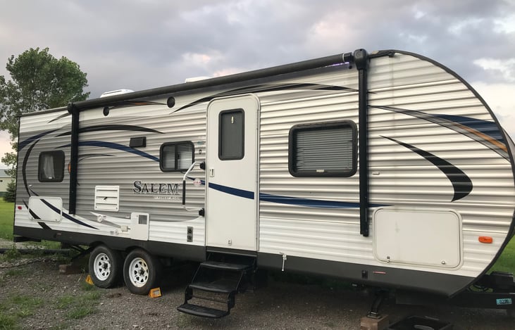 Our Salem by Forest River is a comfortable, well-maintained family-owned camper! In the front of the camper, there is a queen bed with two closets for storage, as well as storage under the bed. The front has privacy doors. The kitchen is in the middle with a sink, counter, 3 burner stove with oven, microwave, refrigerator/freezer, and storage pantry.