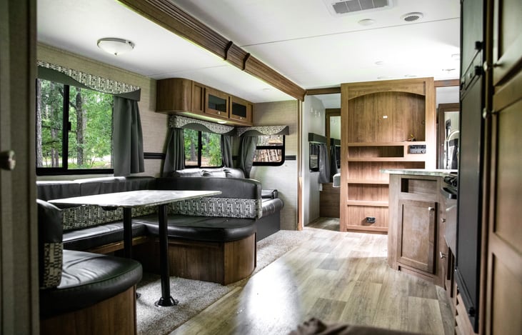 We have a wonderful travel trailer that is great for any family! It is a bunkhouse model with bunks in the rear, jackknife sofa, U shaped seating around the dining table for 6 people, a queen size bed with dual entry doors, and an outside kitchen. The outdoor kitchen offers a gas cooktop, fridge, and a sink! It has one slide out in the kitchen/living area that really open the space up.