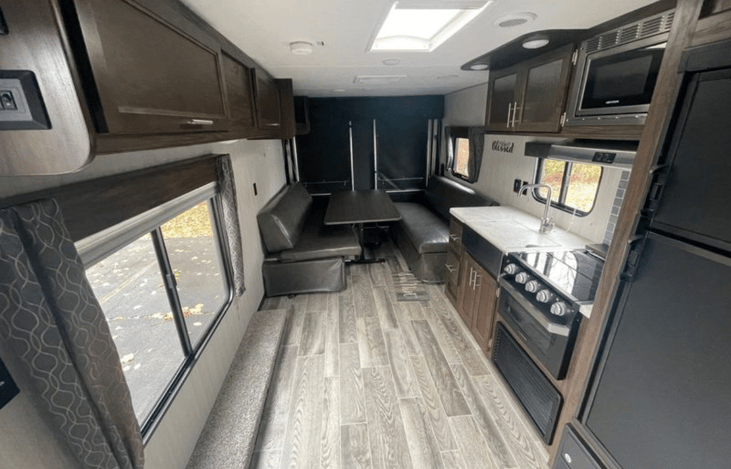 Can sleep up to 6! Master bed room up front with storage and a walk through bathroom, large queen bed in the back and in the kitchen area you can ether have our 2 children’s cots or lay down an air mattress. Sound system inside and out. Nice awning. We can deliver for an extra charge up to 80 miles if able due to time and working. Will need a larger truck to pull.